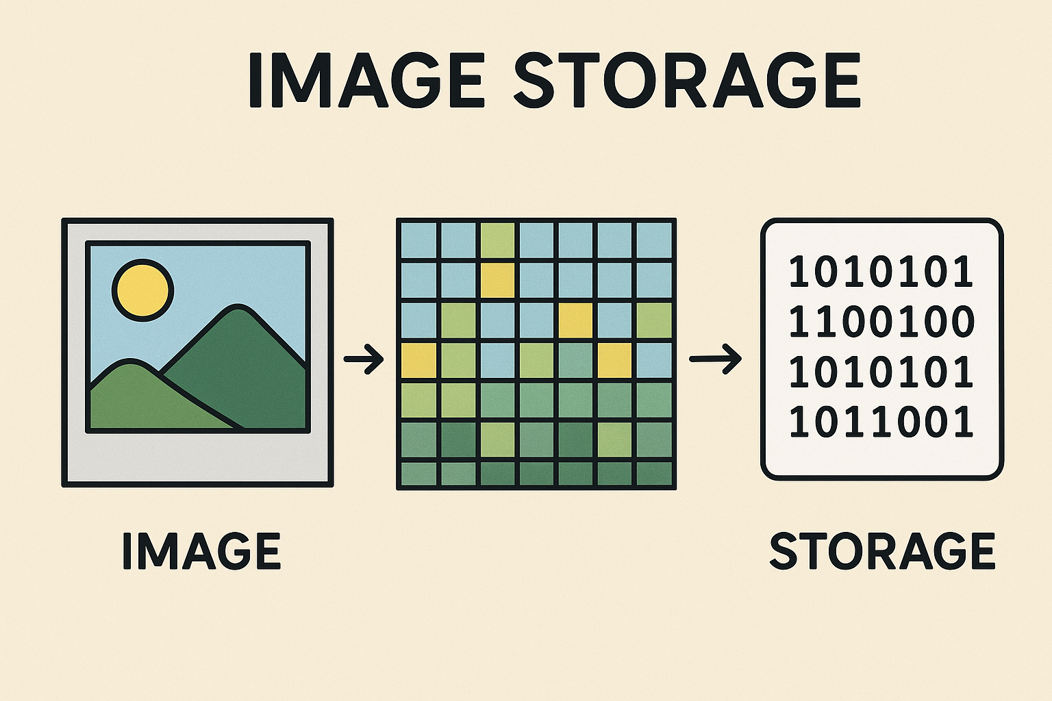 For colour images, pixels are often stored using the RGB model: Red, Green, and Blue values each range from 0 to 255. Example: (255, 0, 0) = pure red.