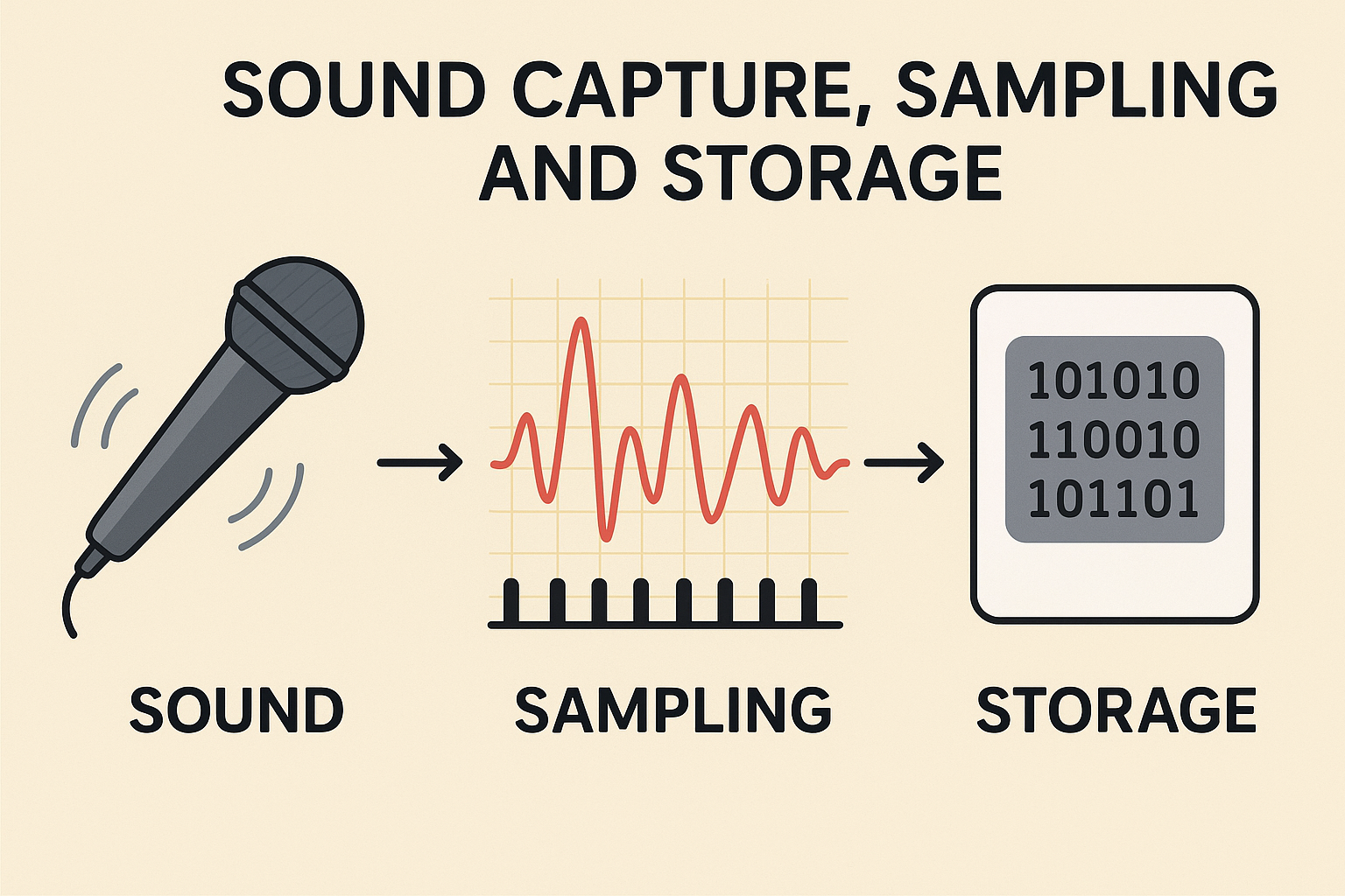 - The sound wave is measured (or sampled) at regular intervals. Each measurement records the amplitude (height) of the wave at that point in time. The number of samples taken per second is called the sample rate (measured in Hz).