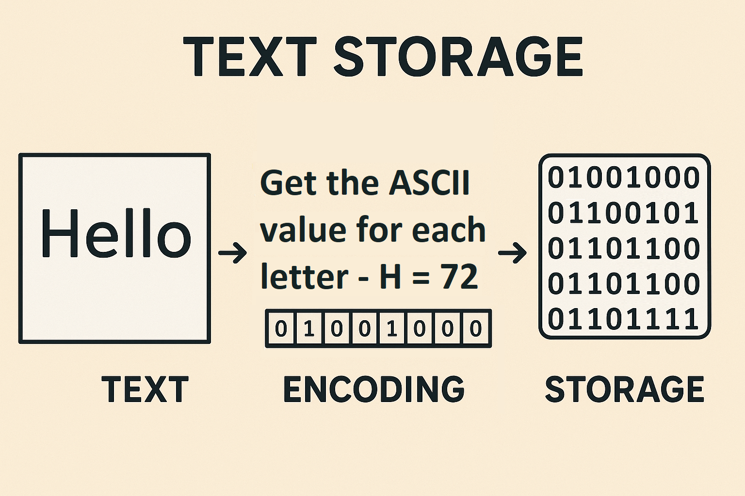 - For example, the letter 'H' is 72, 'e' is 101, 'l' is 108, and 'o' is 111.